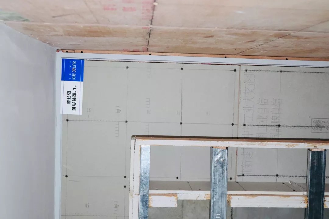 同時(shí)燕尾榫后進(jìn)行背板加固處理,轉(zhuǎn)角處不同于常規(guī)吊頂處理,使用300、600mm的“L”型轉(zhuǎn)角板,以代替第一層石膏板,第二層石膏板進(jìn)行錯(cuò)縫安裝,進(jìn)而使吊頂?shù)慕遣扛邚?qiáng)度接合,避免開裂。
