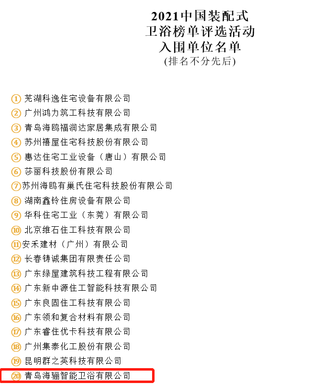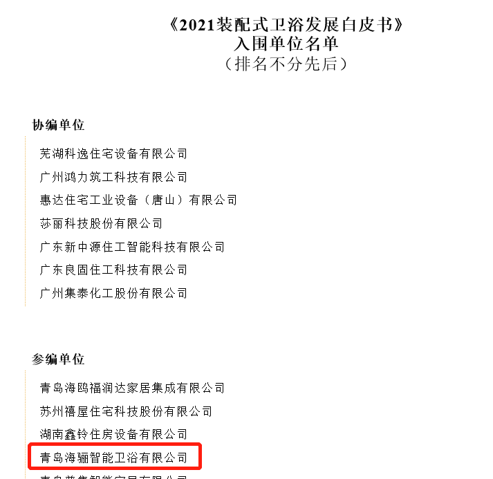 海驪衛(wèi)浴入圍《2021裝配式衛(wèi)浴發(fā)展白皮書(shū)》及行業(yè)榜單
